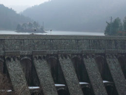 Primo piano della diga del Lago Bruno. Costruito a partire dal 1883 insieme al Lago Lungo per alimentare la rete idrica di Genova, si chiamava originariamente Lago Lavezze. Venne poi ribattezzato Lago Bruno in onore dell'ideatore ed esecutore dei lavori ingegnere Nicolò Bruno - 31 gennaio 2008 |